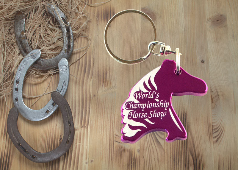 Explore the potential of our horse head key chain bottle opener. Triple Crown appeal for equestrian lovers, schools, businesses, and derby fans. Pick your color from six vivid choices. Engrave it with your logo or message.