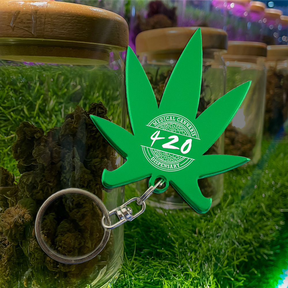 For legalization or recreational purposes, our pot leaf keychain with your message inscribed will have everyone talking at your next party on 420. Our key chain / bottle openers are quality constructed of anodized aluminum metal.
